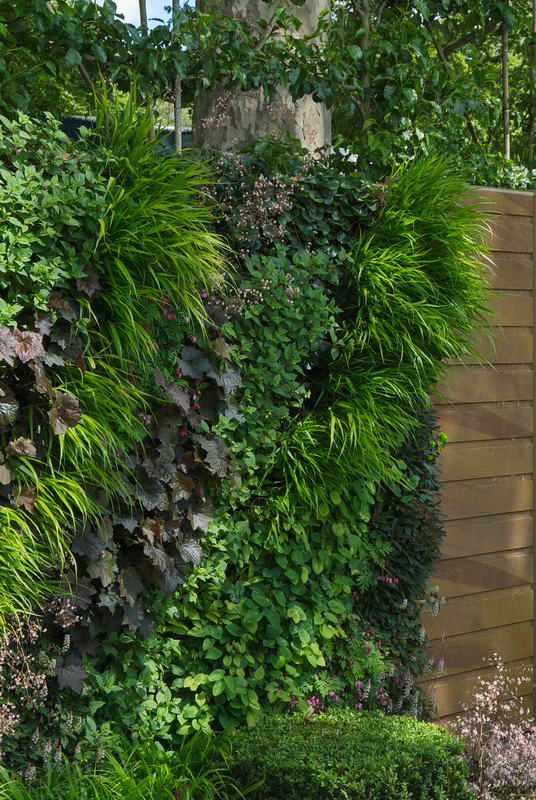 - Buchsbaum, Chelsea Flower Show, Gitterrost, Hedera, Heuchera, Kies, modern, Pflanzenwand, vertikaler Garten, Vorgarten