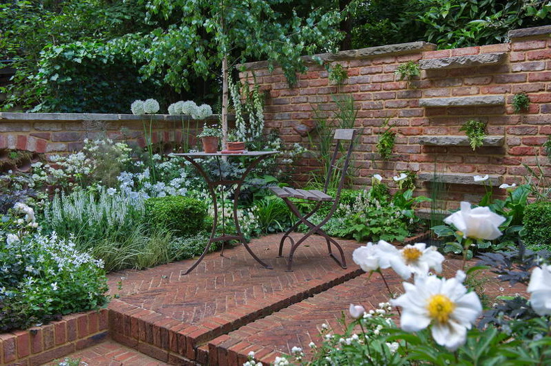 - Chelsea Flower Show, Klinkerpflaster, Mauer, Pflaster, Rinne, Stein, Stuhl, Terrasse, Tisch, Wasser