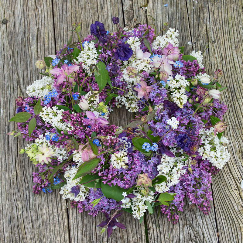 - Kranz aus weißem und rotem Flieder mit Vergissmeinnicht