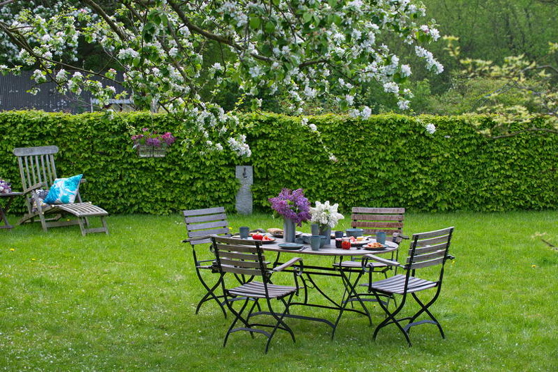 - Apfelbaum, gedeckter Tisch, Hainbuchenhecke, Hecke, Sitzplatz