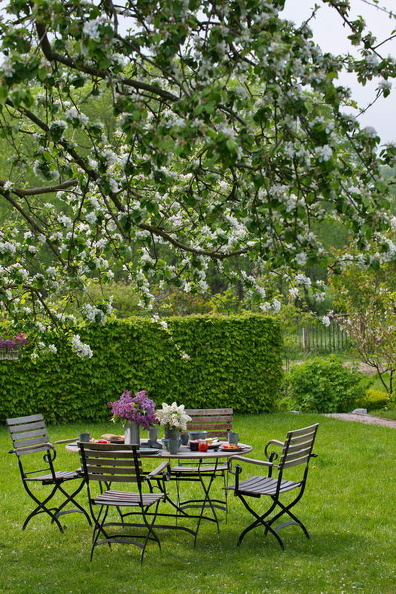 - Apfelbaum, gedeckter Tisch, Hainbuchenhecke, Hecke, Sitzplatz