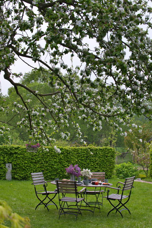 - Apfelbaum, gedeckter Tisch, Hainbuchenhecke, Hecke, Sitzplatz