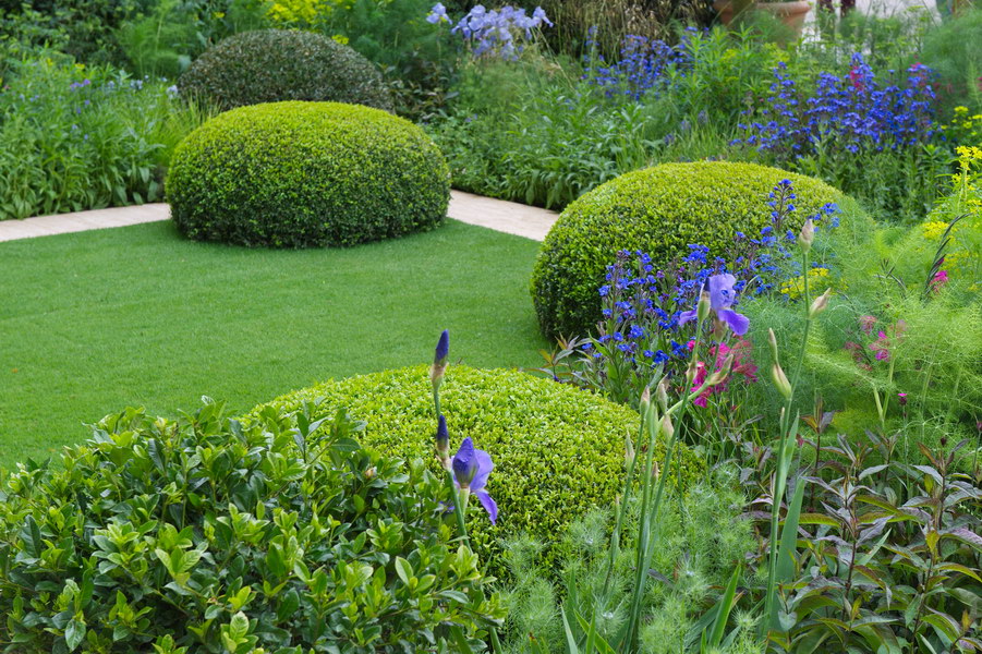 - Anchusa azurea 'Loddon Royalist', Buchsbaumkugel, Buxus sempervirens, Chelsea Flower Show, Formschnitt, Rasen