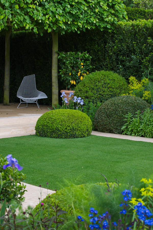 - Buchsbaumkugel, Buxus sempervirens, Chelsea Flower Show, Formschnitt, Laurus nobilis, Linde, Lorbeer, Osmanthus x burkwoodii, Rasen, Schirmgehölz, Tilia x europaea