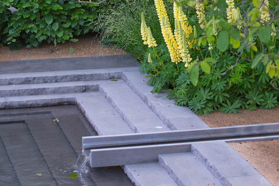 - Chelsea Flower Show, formal, lupine, Lupinus polyphyllus, Stufen, Wasserbecken