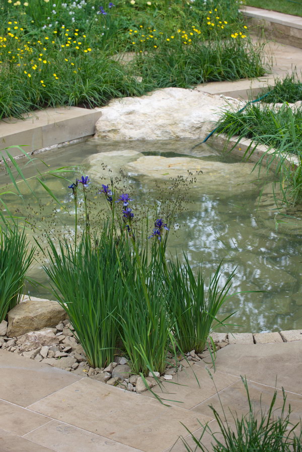 - Briza media, Chelsea Flower Show, Iris, Ranunculus acris citrinus, Wasserbecken
