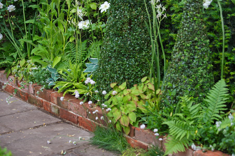 - Beeteinfassung, Buchs, Chelsea Flower Show, Farn, Formschnitt, Hosta, Klinker, Ziegel