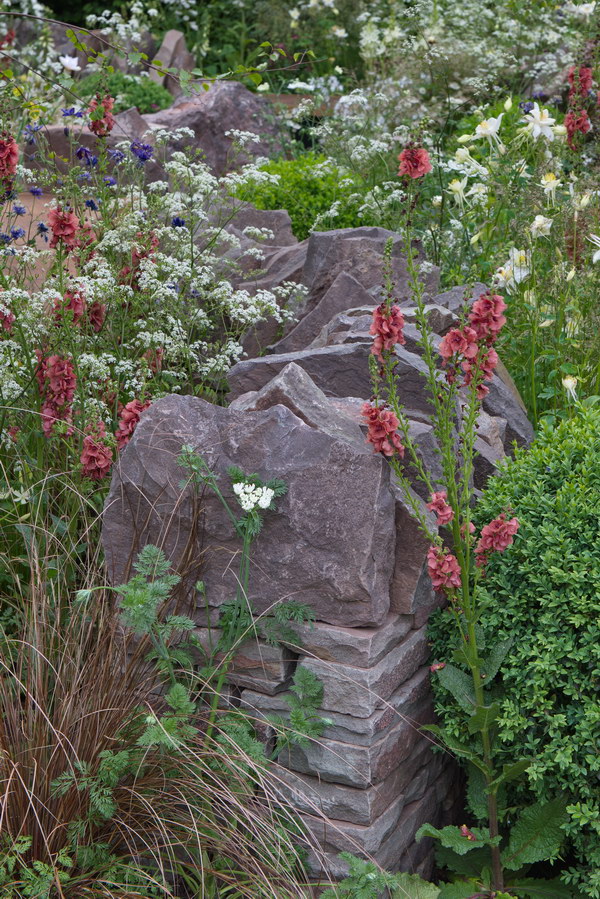 - Aquilegia, Chelsea Flower Show, Mauer, Naturstein, Natursteinmauer, Verbascum phoeniceum