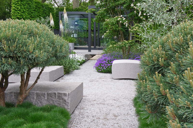 - Chelsea Flower Show, Kies, Stein, Terrasse, Viburnum, Wasserschale