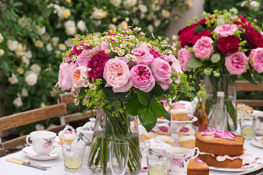 - Chelsea Flower Show, gedeckter Tisch, Rosen, Strauß, Vase