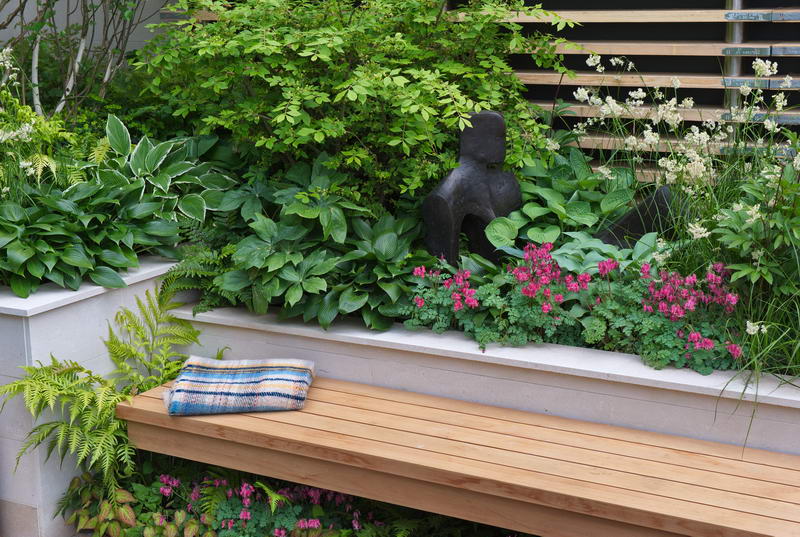 - Bank, Chelsea Flower Show, Dicentra formosa, Epimedium, Hochbeet, Hosta, Schatten, Terrasse