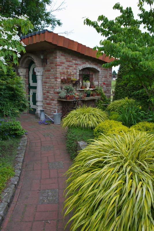 Gartenhaus, Hakonechloa macra 'Aureola', Japan-Goldbandgras, Klinker, Garten Mekelburg