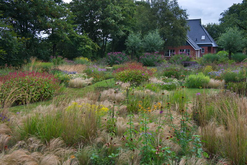 - Bistorta amplexicaule, Gräser, Jacobstuin, Leonotis nepetifolia, Rudbeckia, Stipa tenuissima
