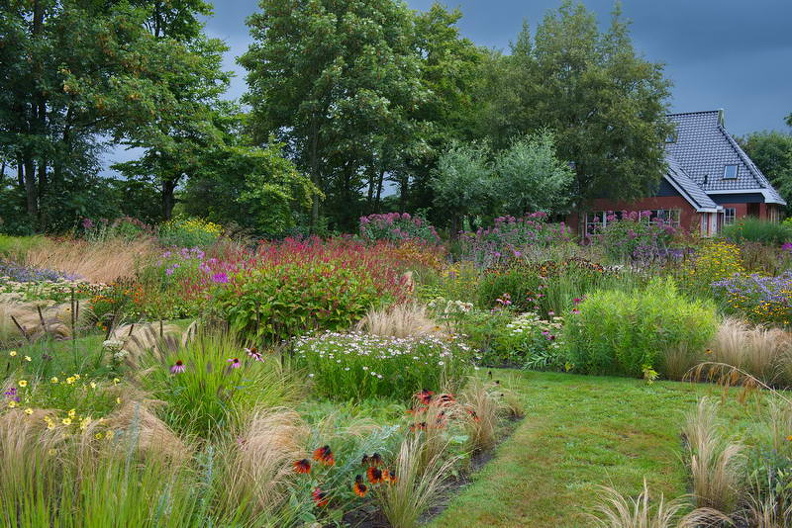 - Rudbeckia, Sedum 'Matrona', Stipa tenuissima, Gräser, Jacobstuin