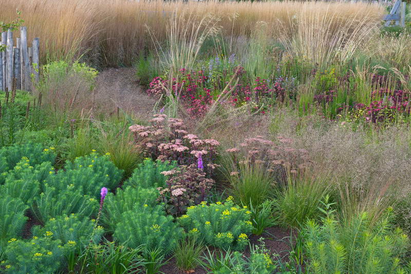 - Gräser, Sedum 'Karfunkelstein', Sedum 'Matrona', Euphorbia cyparissias