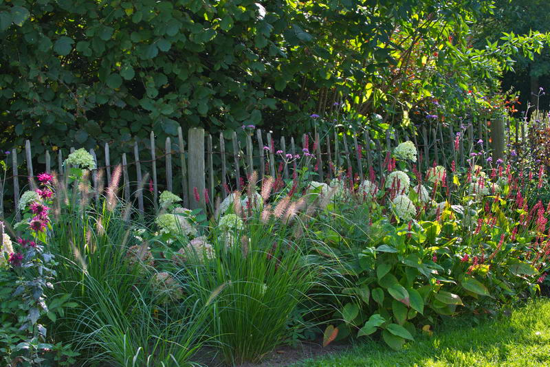- Bistorta amplexicaule, Hydrangea paniculata 'Limelight', Pennisetum, Rispenhortensie, Zaun, De Beukenhof, Ellen u. Hans Lubbers