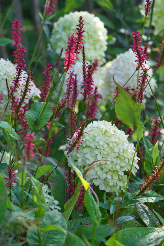 - Bistorta amplexicaule, Hydrangea paniculata 'Limelight', Rispenhortensie, De Beukenhof, Ellen u. Hans Lubbers