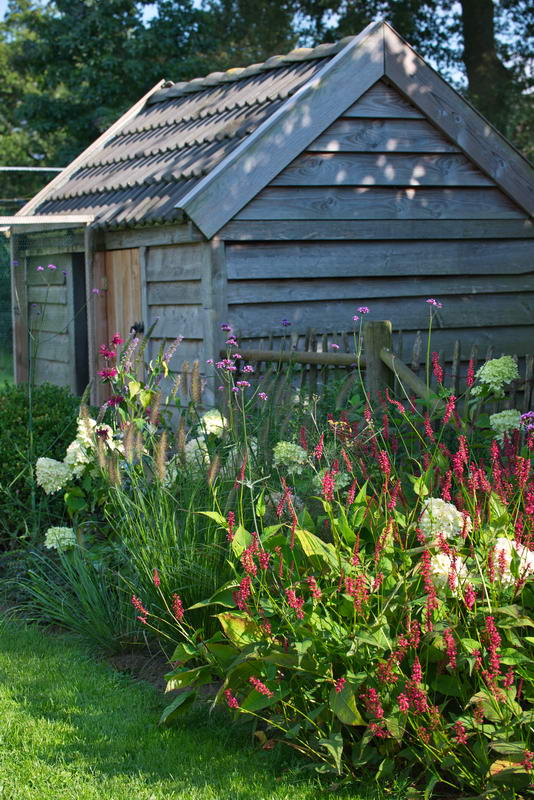 - Bistorta amplexicaule, Hydragena paniculata 'Limelight', Pennisetum, Rispenhortensie, Zaun, Schuppen, Stall