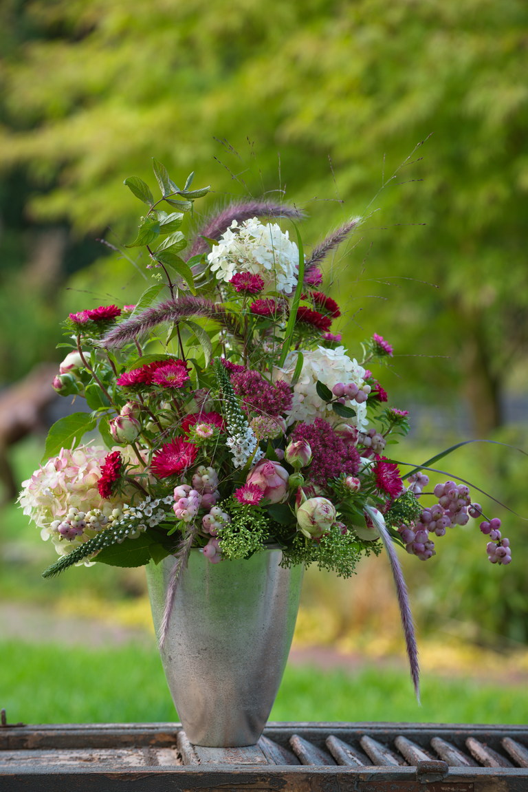 Astern, Hortensie, Pennisetum, Rosen, Sedum, Strauß