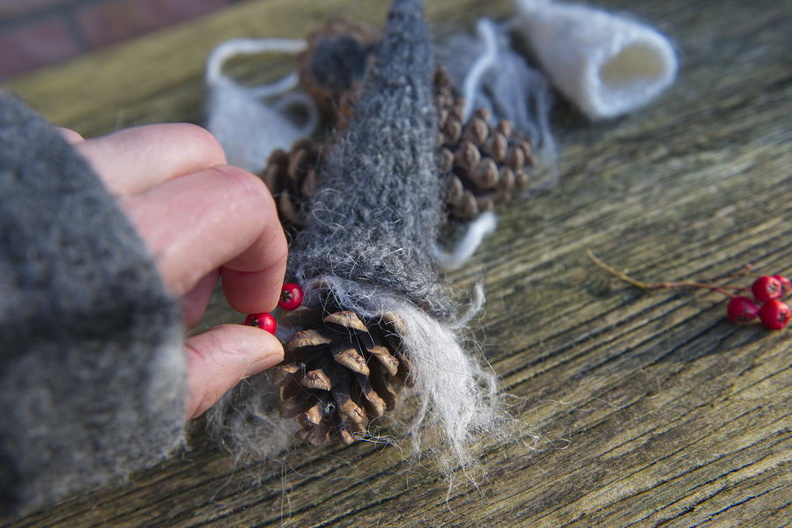 - basteln, Tannenzapfen, Wolle. Mütze