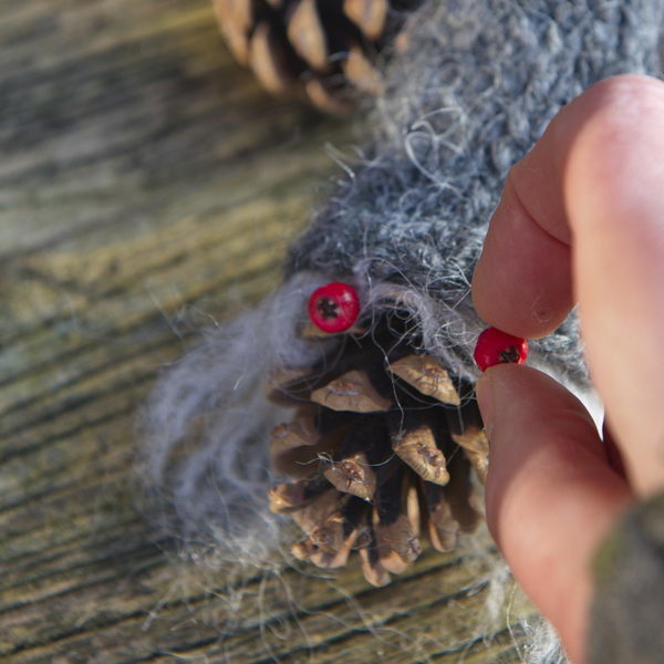 - Tannenzapfen, Wolle. Mütze, basteln