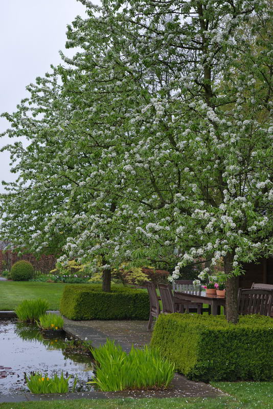 - Pyrus salicifolia, Sitzplatz, Wasserbecekn, weidenblättrige Birne