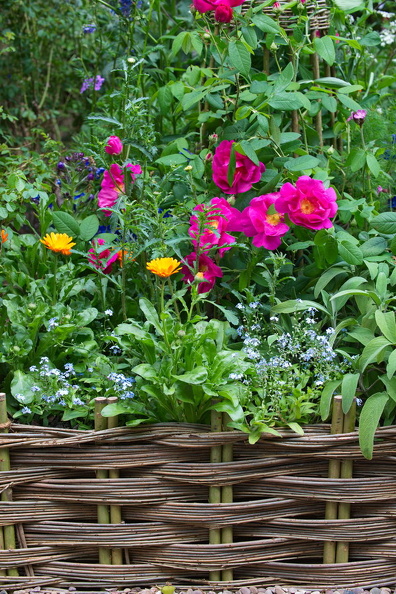 - Beeteinfassung, Chelsea Flower Show, Flechtzaun, Kies, Weide