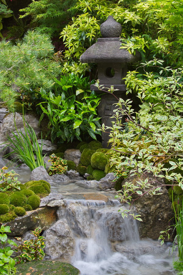 - Bach, Chelsea Flower Show, Japan, Japangarten, Moos, Steinlaterne, Wasserfall