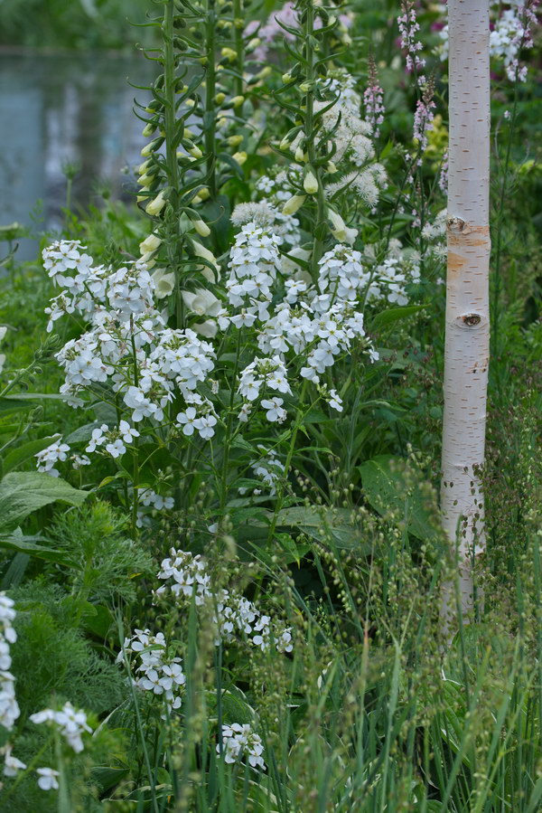 - Betula utilis 'Jacquemontii', Chelsea Flower Show, Digitalis, Lunaria, weiß
