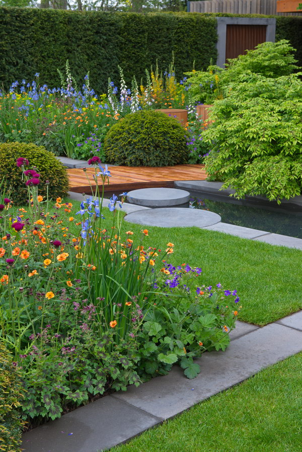 - Chelsea Flower Show, Euonymus alatus, Geranium phaeum, Geranium sylvatica, Geum, Iris sibirica, modern, Wasser
