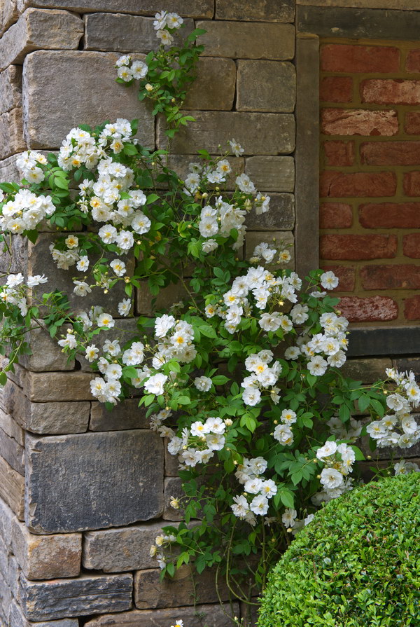 - Buchsbaum, Chelsea Flower Show, Mauer, Naturstein, Rose 'Rambling Rector', Wand, weiß