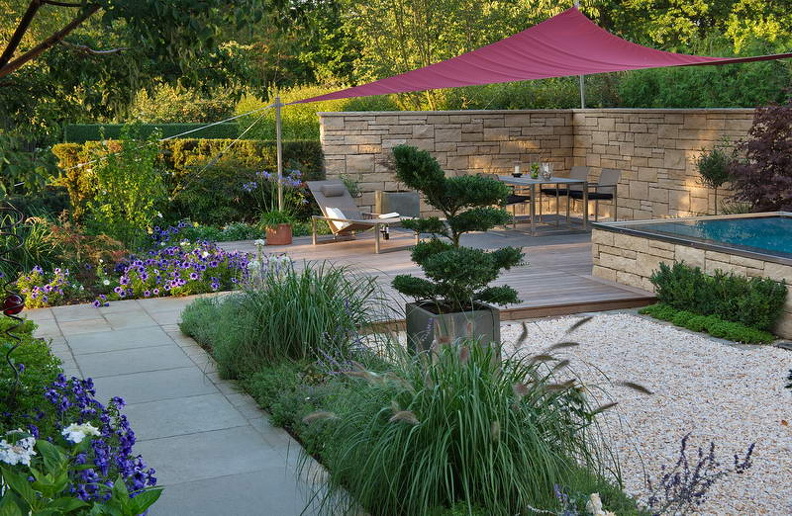 - Garten Wandrey, Mauer, Sitzgruppe, Sonnensegel, Terrasse