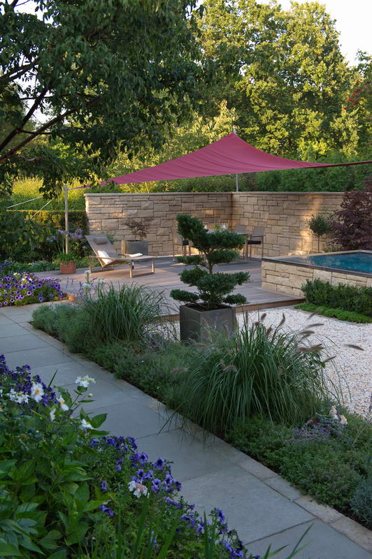 - Garten Wandrey, Mauer, Sitzgruppe, Sonnensegel, Terrasse
