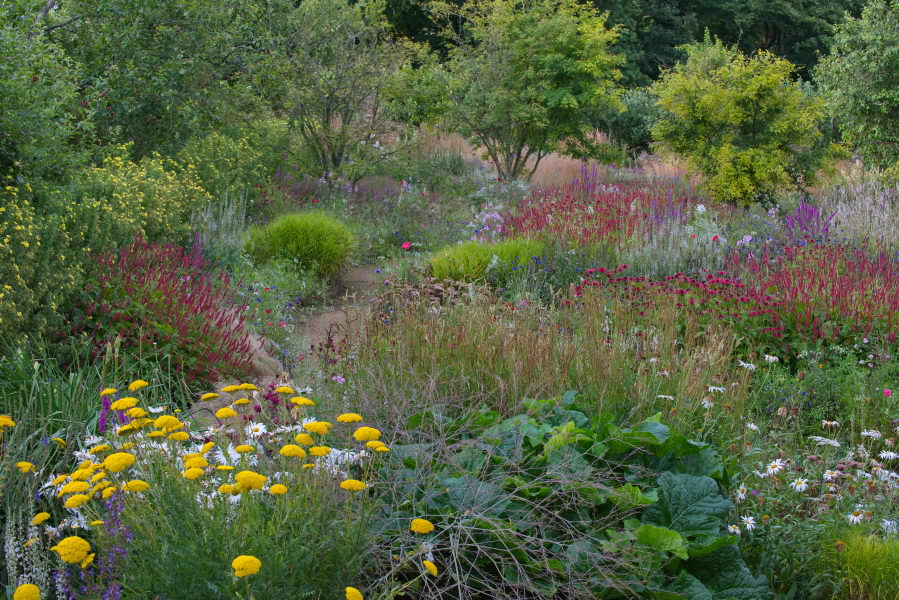 - Achillea 'Gold Plate', Monarda, Persicaria bistorta 'Superba', Präriebeet, Präriegarten, Cambo Garden