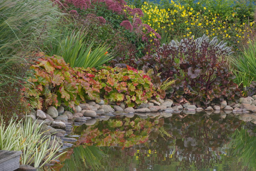 - Darera petala, Eupatorium, Feldsteine, Garten der Horizonte, Ligularia, Schildblatt, Teich