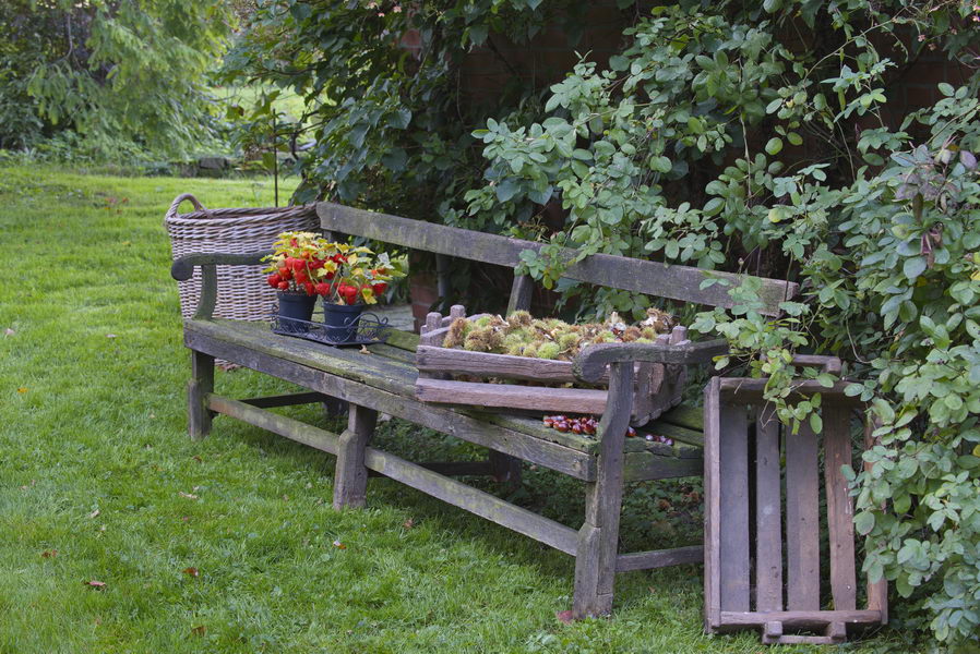 alt, Bank, Kastanien, Physalis, Rasen, Weidenkorb