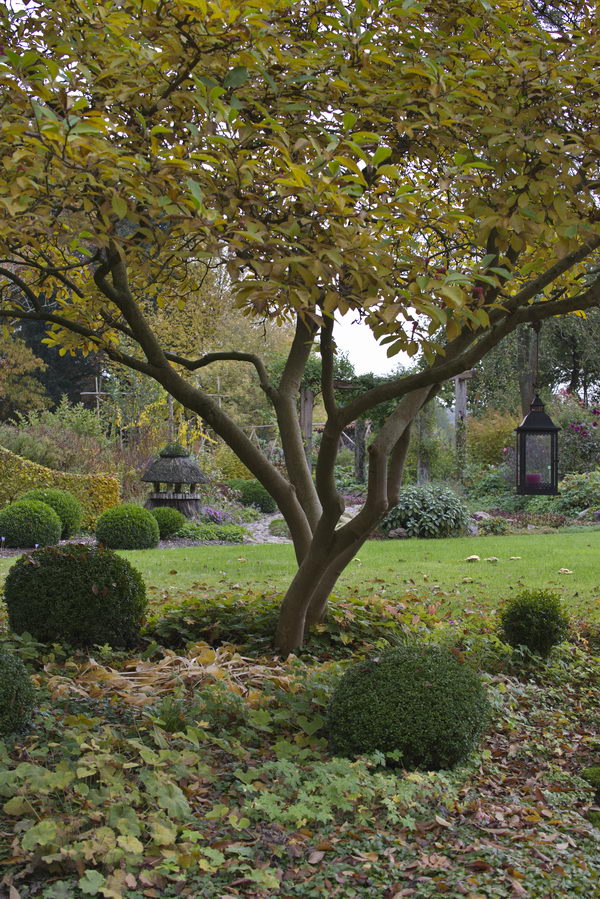 - Buchsbaumkugeln, Laterne, Magnolia, Rasen, Hecke