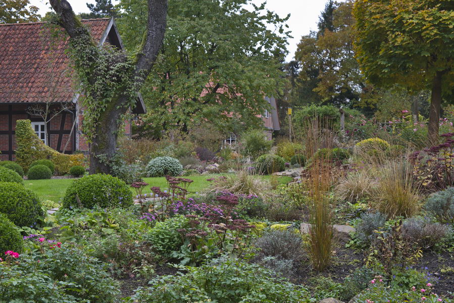 - Acer, Bauerngarten, Buchs, Fachwerkhaus, Kugelbaum, Sedum