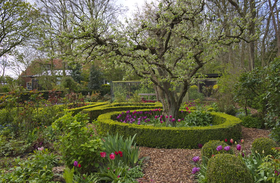 - Buchsbaum, Hecke, Kreis, Mulch, rund, Tulpe, lila, Tuin 't Hofje Familie Cijsouw
