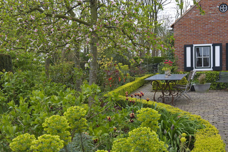 - Buchsbaum, Hecke, Pflaster, Terrasse, Tulpe 'Gavota', Tulpe 'Ballerina', Tuin 't Hofje Familie Cijsouw