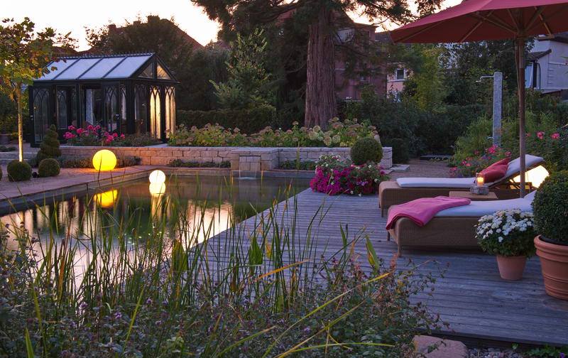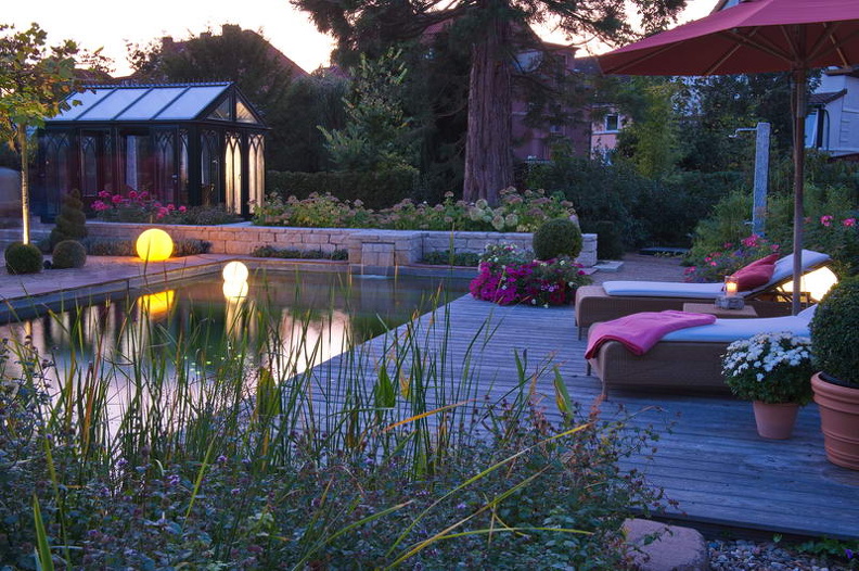 - Abend, Beleuchtung, Holzdeck, Licht, Schwimmbecken, Schwimmteich, Garten Zinsser