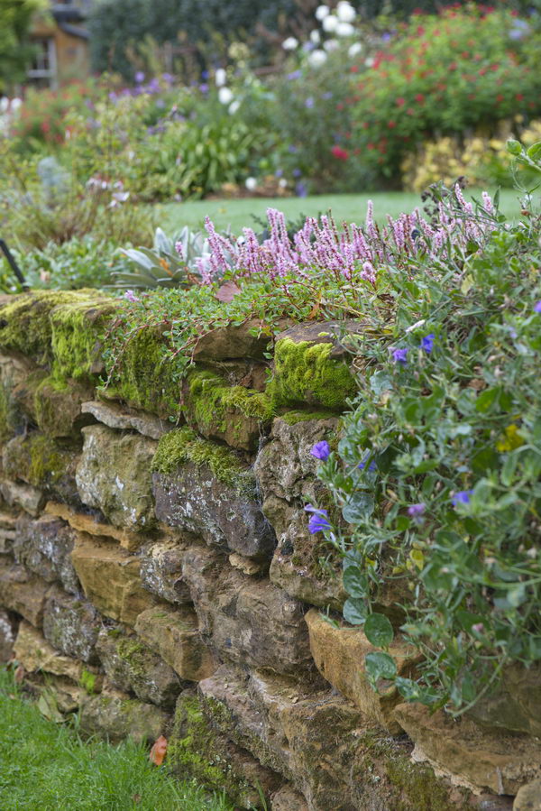 - Coton Manor Gardens, Mauer, Naturstein, Persicaria vaccinifolia, Polygonum Vacciniifolium, Steingarten