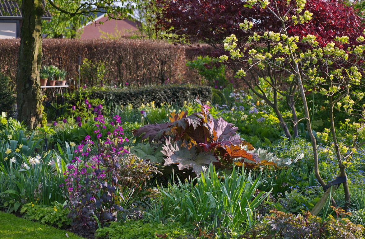 - Cornus, Gehölz, Lunaria annua 'Chedglow', Rheum palmatum var. tanguticum