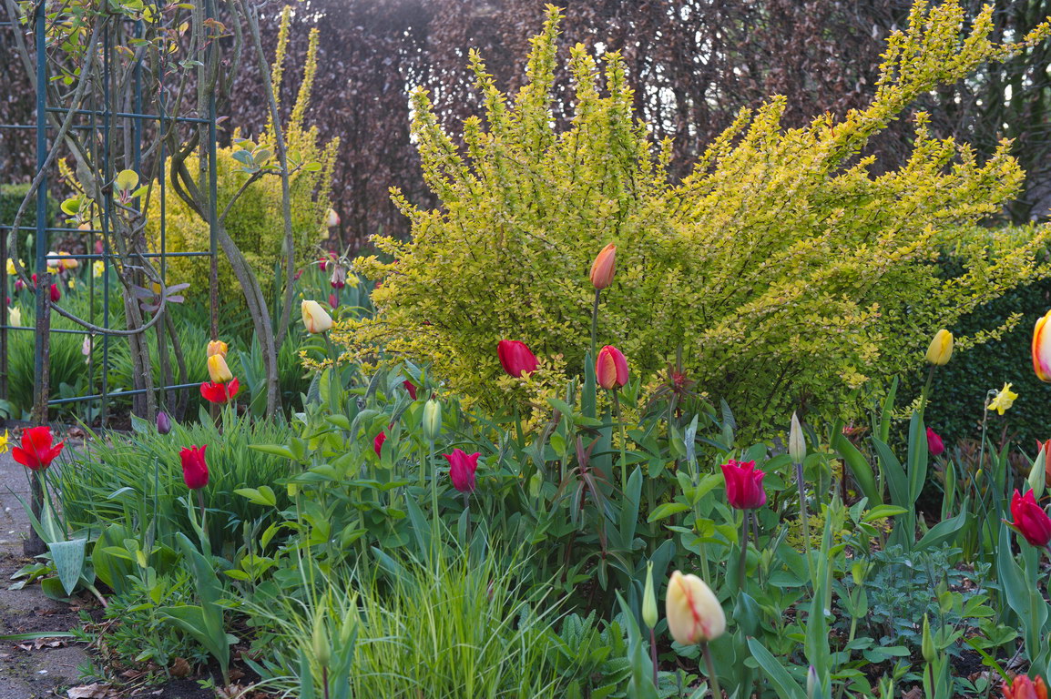 - Berberis thunbergii 'Maria', Goldberberitze, Tulpe 'Request', Tulpe 'Pretty Woman', Tulpe 'Johan Cruff', Tulpe 'Recreado'
