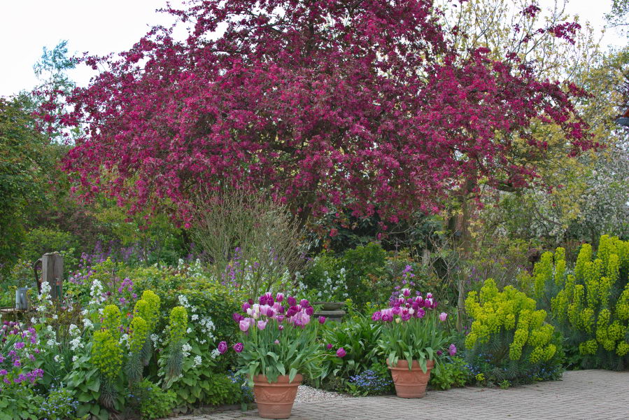 - Euphorbia characias ssp. wulfenii, Garten Elisabeth Imig und Silke Imig-Gerold, Malus 'Rudolph', Tulpe 'Blue Diamond', Tulpe 'Candy Prince', Tulpe 'Negrita', Tulpe 'Purple Prince', Tulpe 'Shirley', Tulpe 'Synaeda Amor', Tulpe 'Synaeda Blue'