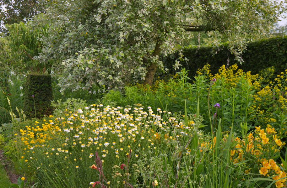 - Anthemis tinctoria 'Susanna Mitchell', Taxus, Fam. Griet en Geert Reusen-S'heeren