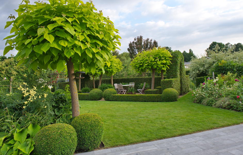 - Buchs, Catalpa bignonioides 'Aurea', Hecke, Sitzplatz, Thalictrum lucidum, Fam. Griet en Geert Reusen-S'heeren