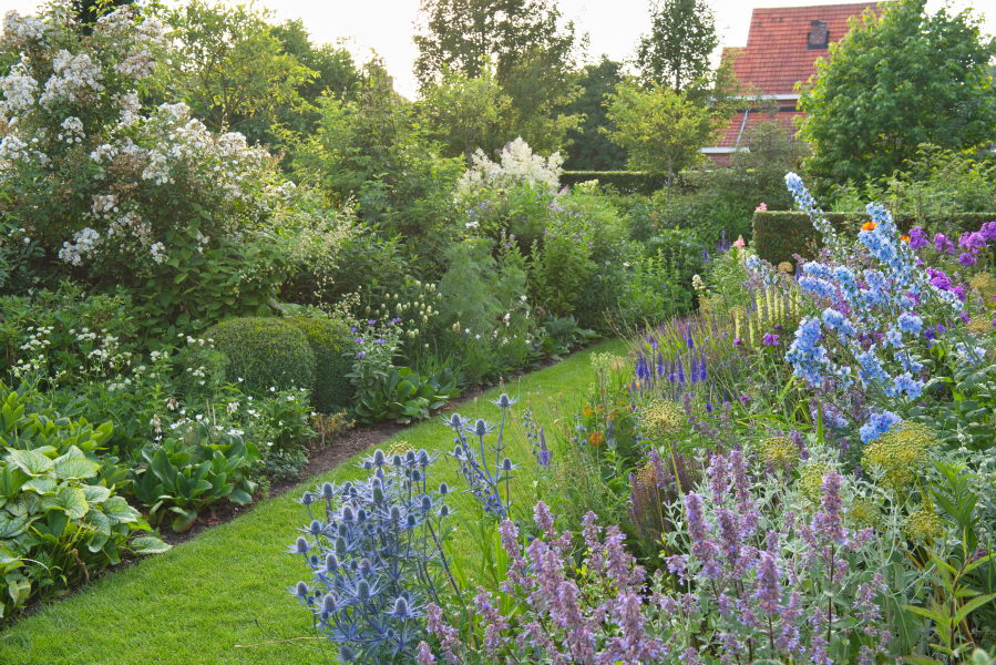 - Delphinium, Eryngium bourgatii, Kletterrose 'Guirlande d`Amour', Rittersporn, Trifolium, Fam. Griet en Geert Reusen-S'heeren