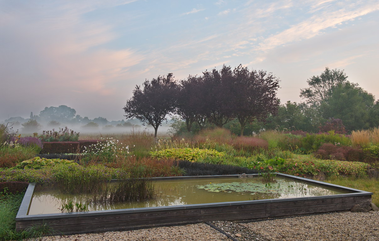 - Blutpflaume 'Nigra', Ophiopogon planiscapus 'Niger', Präriegarten, Prunus cerasifera 'Nigra', Teich, Wasserbecken