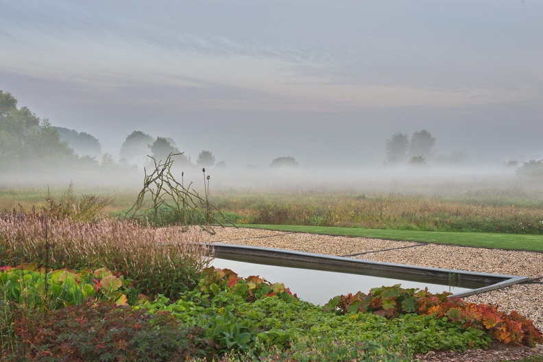 - Bergenia, Blutpflaume 'Nigra', Ophiopogon planiscapus 'Niger', Präriegarten, Prunus cerasifera 'Nigra', Teich, Wasserbecken